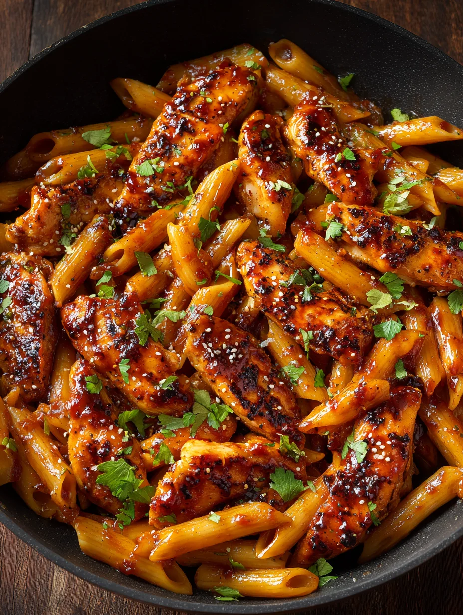 Easy One Pan Tangy Honey BBQ Chicken Penne Dinner
